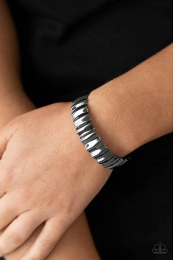 Polished in a high sheen finish, a crinkled gunmetal cuff delicately curls around the wrist for an intense industrial look.