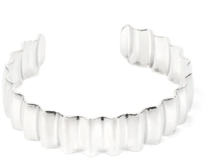 Polished in a high sheen finish, a crinkled silver cuff delicately curls around the wrist for an intense industrial look.