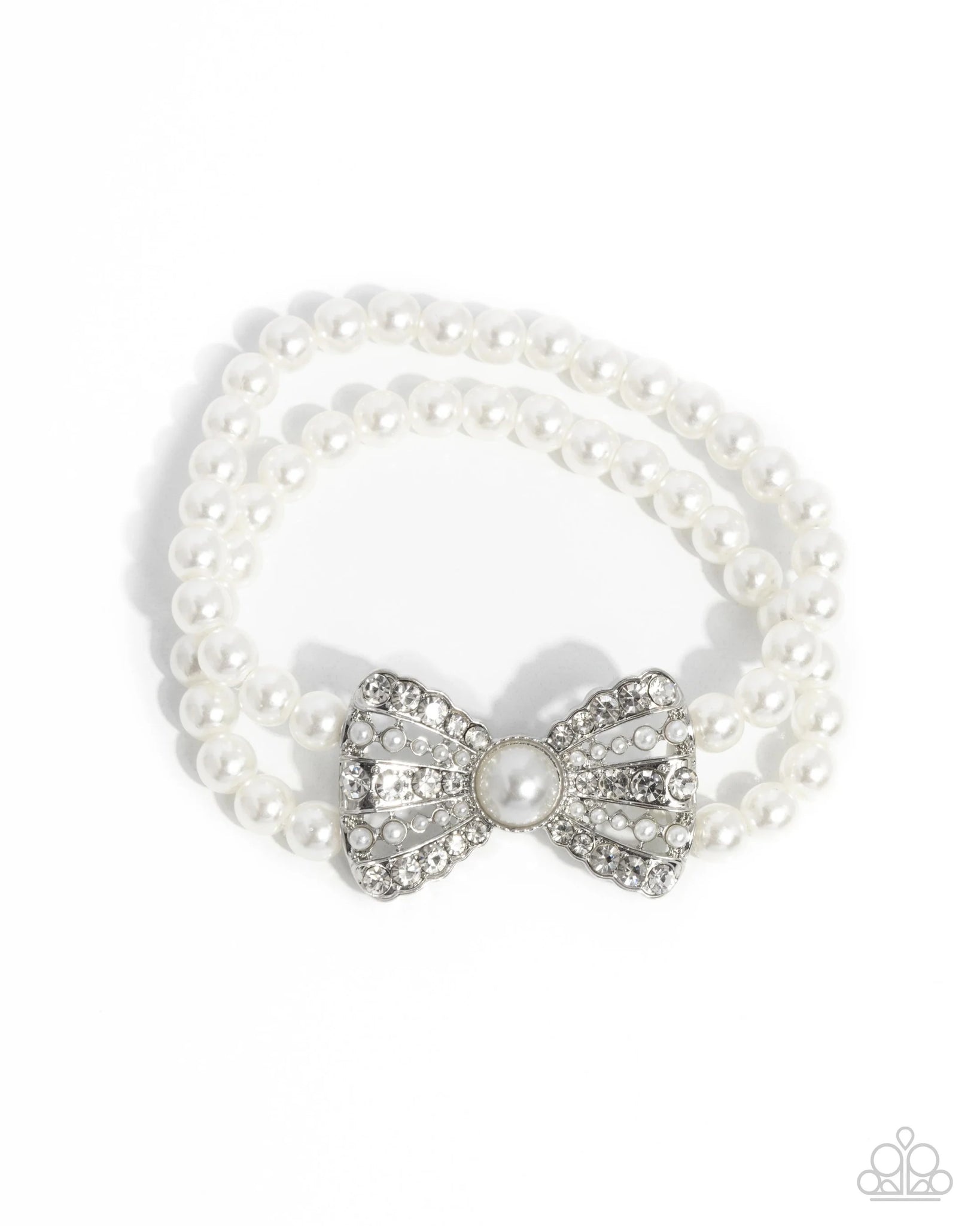 Strung along elastic stretchy bands, two strands of high-sheen classic white pearls wrap around the wrist. Featured along the pearly strands, an airy silver bow, filled with glistening white rhinestones and pearls from a pearly center is attached to the center of the wrist for a dramatically dazzling finish.