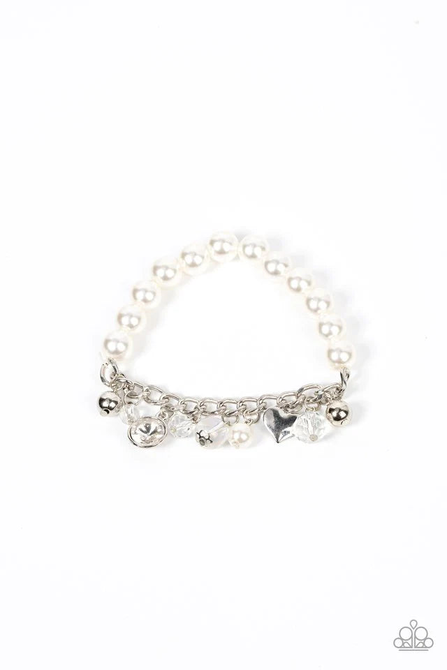 Mismatched silver beads, white pearls, crystal-like accents, gems and heart charms dance from a section of silver chain that attaches to a stretchy band of white pearls around the wrist for a flirtatious sparkle.