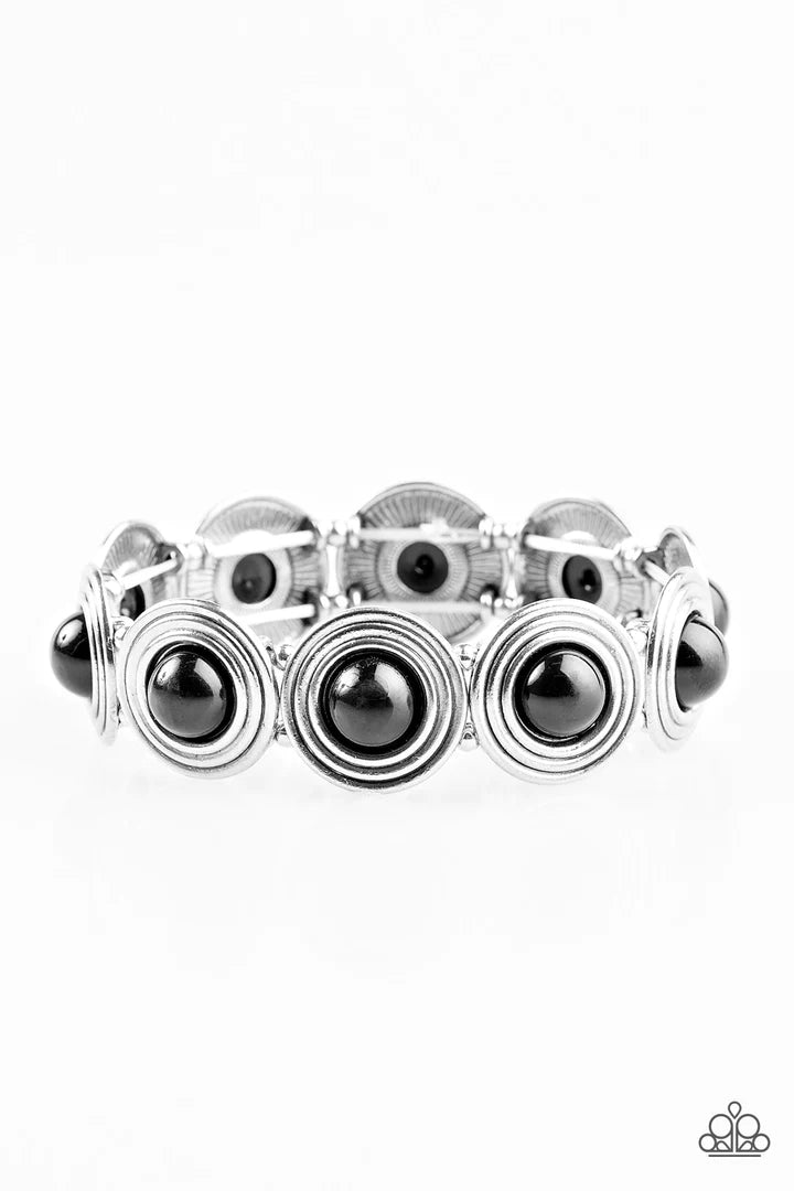 Shiny black beads are pressed into the centers of glistening silver frames radiating with swirling textures. The dizzying frames are threaded along elastic stretchy bands and connect around the wrist for a tribal inspired look.