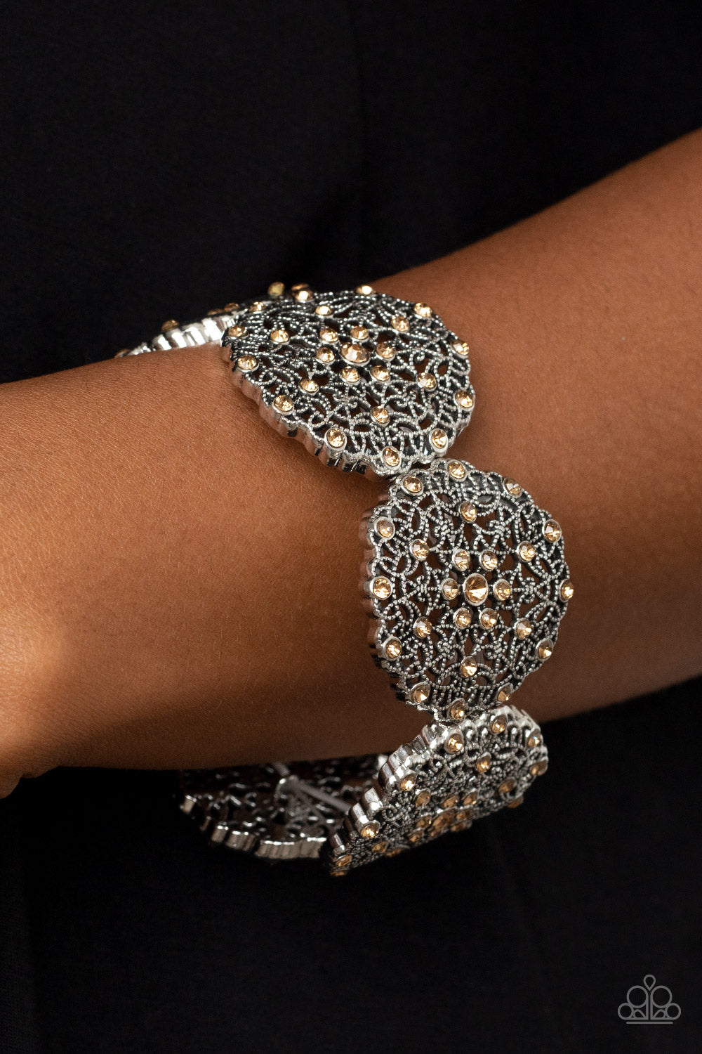 Dotted with golden topaz rhinestones, studded silver frames are filled with mandala-like filigree details and threaded along stretchy bands around the wrist for a glitzy pop of color.
