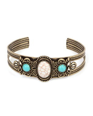 Dotted with a pair of turquoise stone beads, brass floral filigree blooms out from an oval white stone centerpiece atop a studded brass cuff.