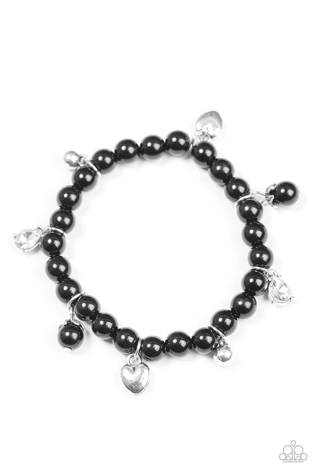 Shiny black beads are threaded along a stretchy elastic band for a refined look. Varying in shape and shimmer, shiny silver heart charms, glittery white rhinestones, and beads swing from the wrist for an elegant finish. Sold as one individual bracelet.