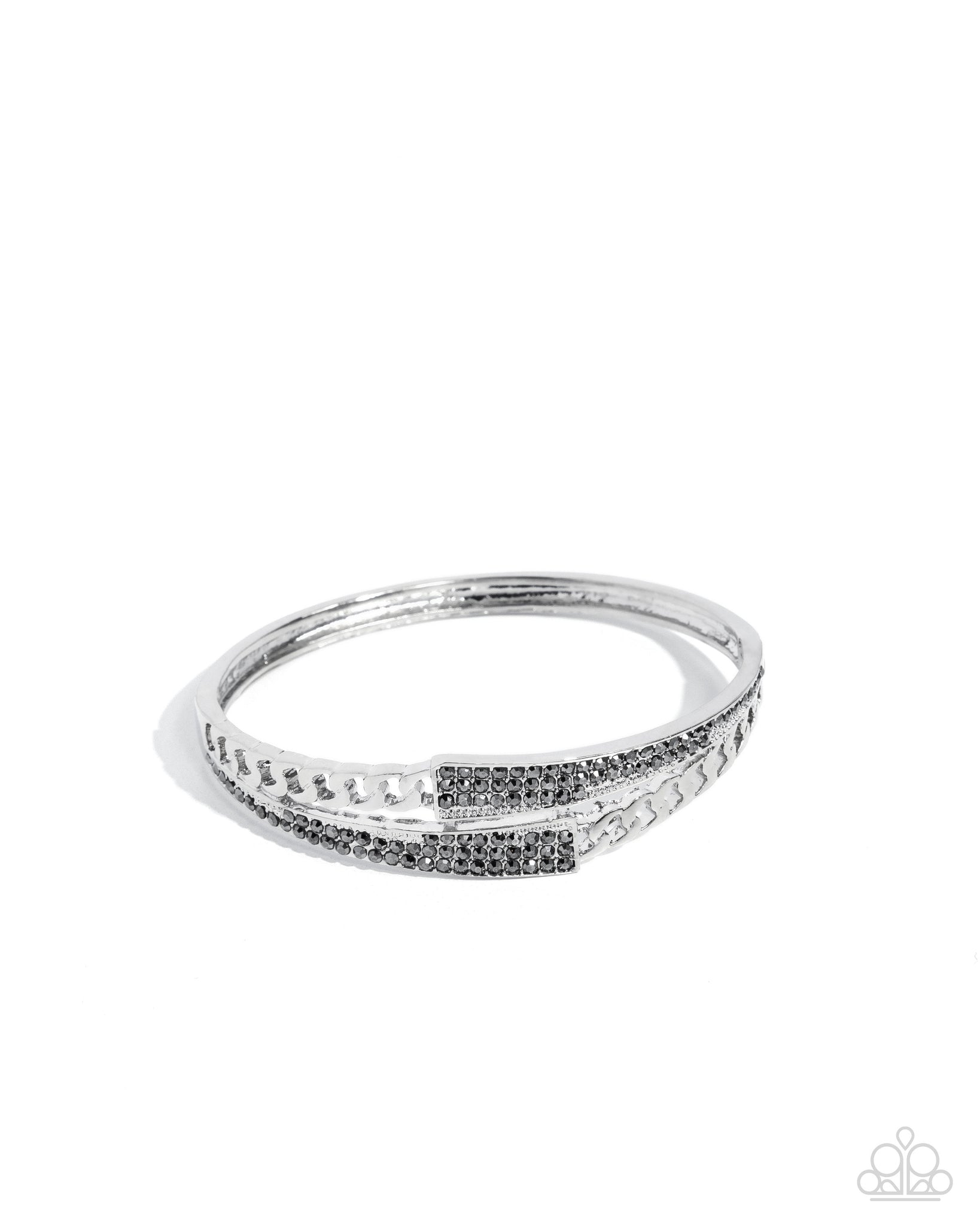 A classic silver cuff-like bangle featuring hematite rhinestone-dusted tapered accents and curb chain links wrap around the wrist for a layered look. Features a hinge closure.