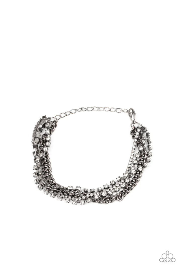 Meticulously mismatched rows of glistening gunmetal chains and strands of glittery white rhinestones layer around the wrist, creating an edgy sparkle. Features an adjustable clasp closure.