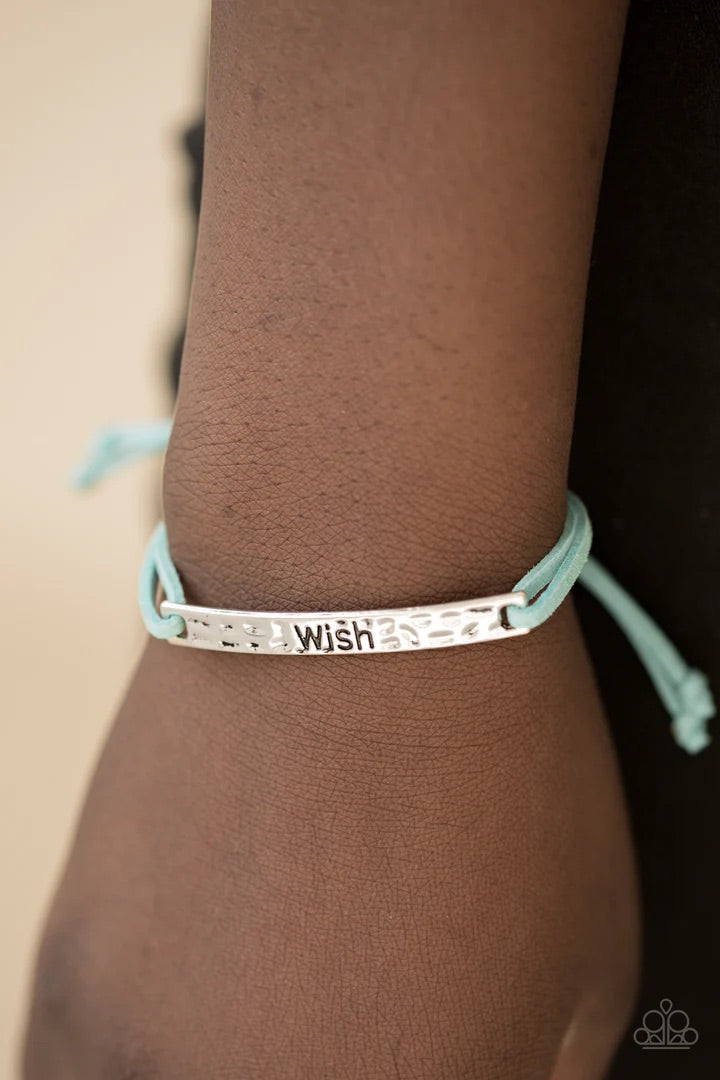 Refreshing blue strands of suede loop through a delicately hammered plate. The shimmery frame is stamped in the word, “Wish” for a whimsical look. Features an adjustable sliding knot closure.