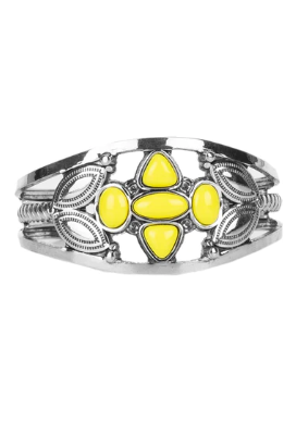 A shapely assortment of Illuminating acrylic beads adorn the center of a layered silver cuff adorned in leafy silver texture, creating a vivacious pop of color around the wrist.