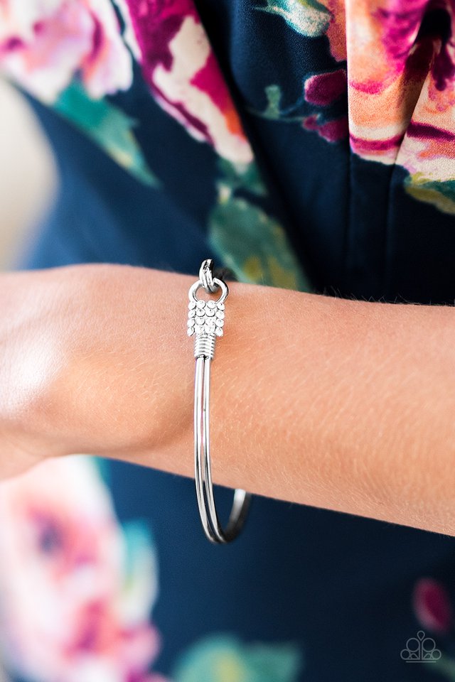 Glistening silver bars curl around the wrist, creating a dainty bangle. Encrusted in rows of glittery white rhinestones, a sparkling square frame adorns the shimmery bars, creating a refined centerpiece. Features a hinged clasp. Sold as one individual bracelet.