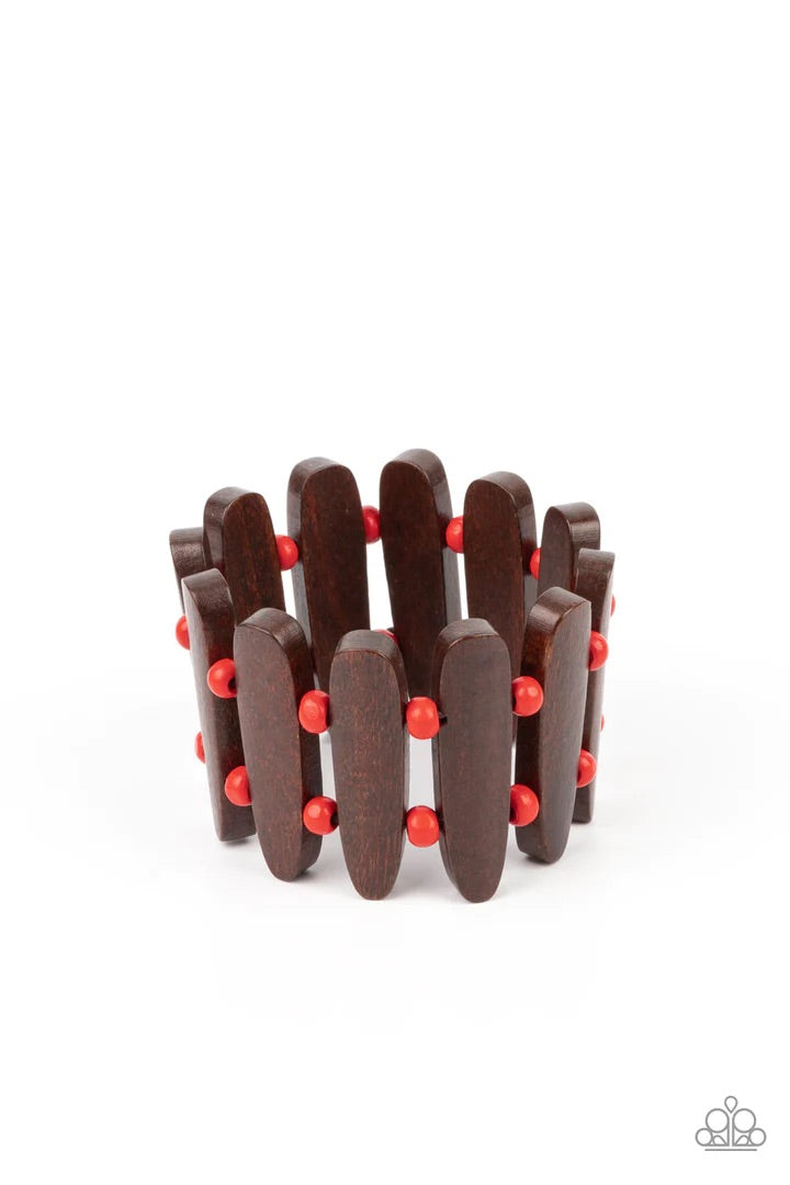 Pairs of fiery red wood beads and oblong brown wooden frames alternate along stretchy bands around the wrist for a seasonal pop of color.