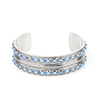 Etched and embossed in stacks of linear texture, an antiqued silver cuff is bordered in rows of faceted Spring Lake beads for a refreshing finish.