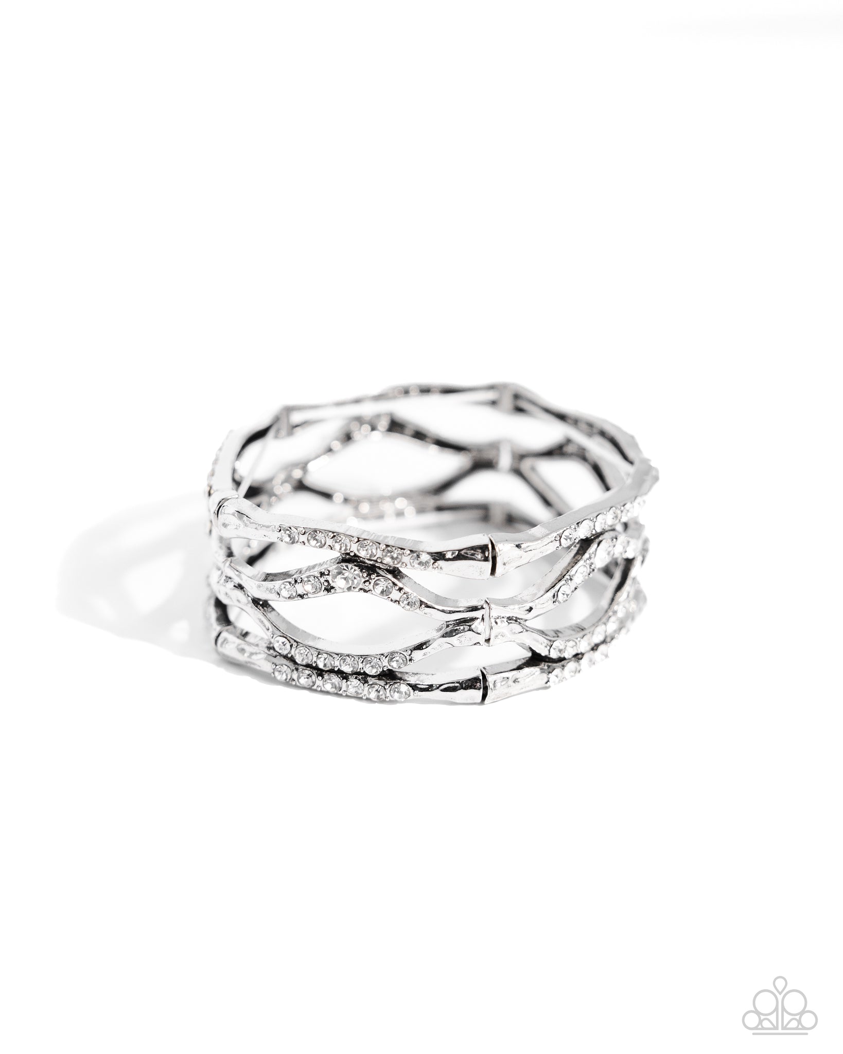 Dusted in sections of dainty silver studs and dainty white rhinestones, asymmetrical silver bars, lightly hammered with antiqued texture, boldly crisscross the wrist into five dramatically abstract frames on elastic stretchy bands for a gritty yet glamorous statement.