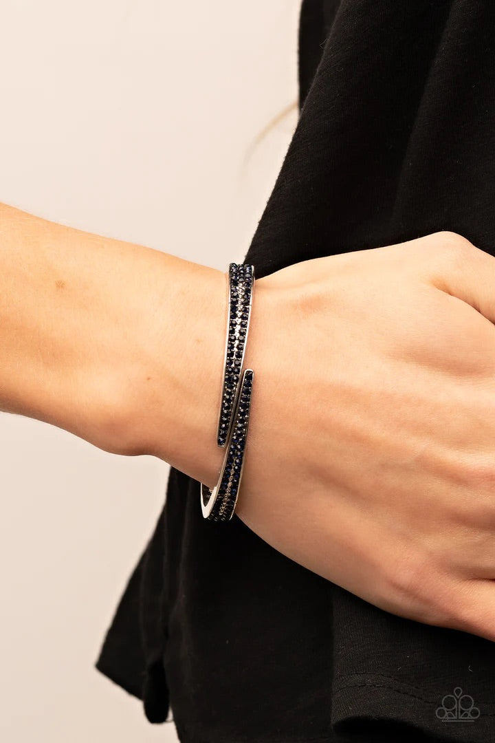 Encrusted in stacked sections of antiqued silver studs and glittery blue rhinestones, two silver bars delicately overlap at the center of the wrist, resulting in an edgy cuff-like bangle. Features a hinged closure.