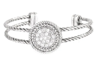 Brushed in an antiqued shimmer, twisted silver bars arc across the finger, coalescing into an airy cuff. Radiating in silver studs and glittery white rhinestones, a round silver frame adorns the center for an edgy look.