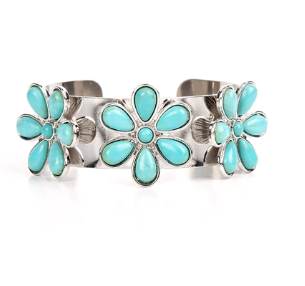 Dotted with turquoise stone centers, a trio of turquoise stone petaled flowers bloom atop a thick silver cuff for a whimsical pop of floral fashion.