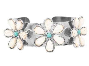 Dotted with turquoise stone centers, a trio of white stone petaled flowers bloom atop a thick silver cuff for a whimsical pop of floral fashion.