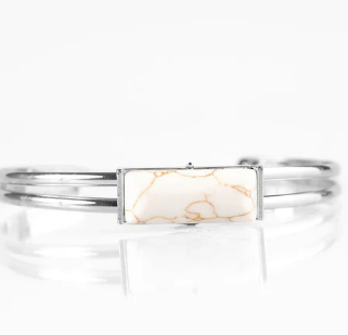 Chiseled into an alluring rectangle, a refreshing white stone is pressed into the center of a dainty silver cuff for a seasonal look. Sold as one individual bracelet.