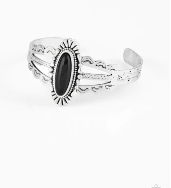 Stamped in tribal inspired patterns, a scalloped silver cuff curls around the wrist. A refreshing black stone is pressed into the center of the cuff, creating a whimsical centerpiece.