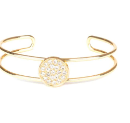Glittery white rhinestones are encrusted along the front of a shimmery gold disc atop the center of a dainty gold cuff for a dazzling look. Sold as one individual bracelet.