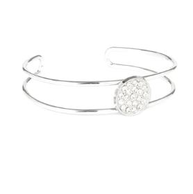 Glittery white rhinestones are encrusted along the front of a shimmery silver disc atop the center of a dainty silver cuff for a dazzling look. Sold as one individual bracelet.