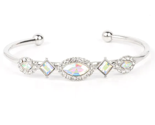Bordered in glassy white rhinestones, a dainty arrangement of marquise cut iridescent rhinestones alternates with tilted square cut iridescent rhinestones across the front of a dainty silver cuff for a surprisingly sparkly finish.