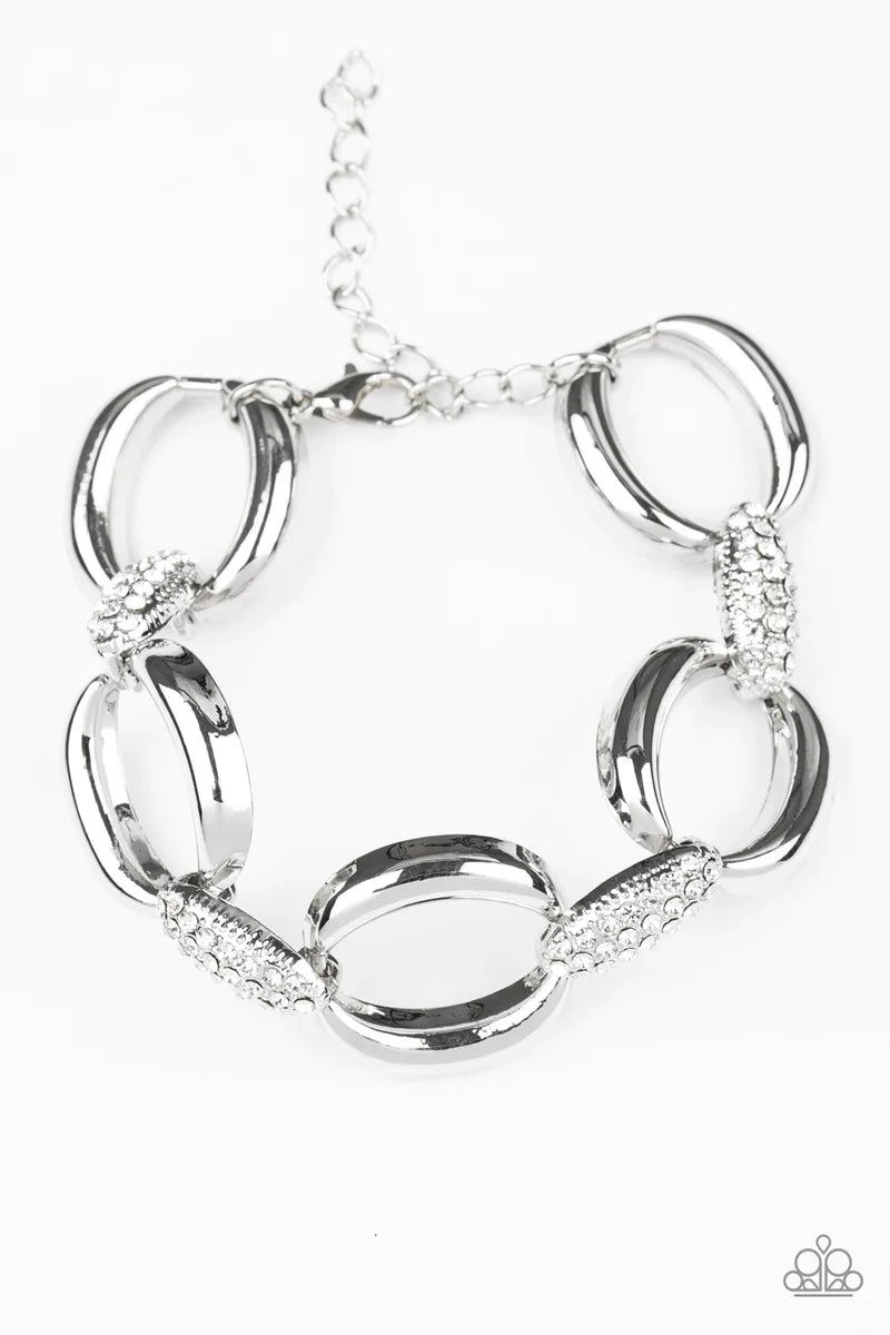 Bold silver links join with white rhinestone encrusted frames around the wrist for a fierce look. Features an adjustable clasp closure.