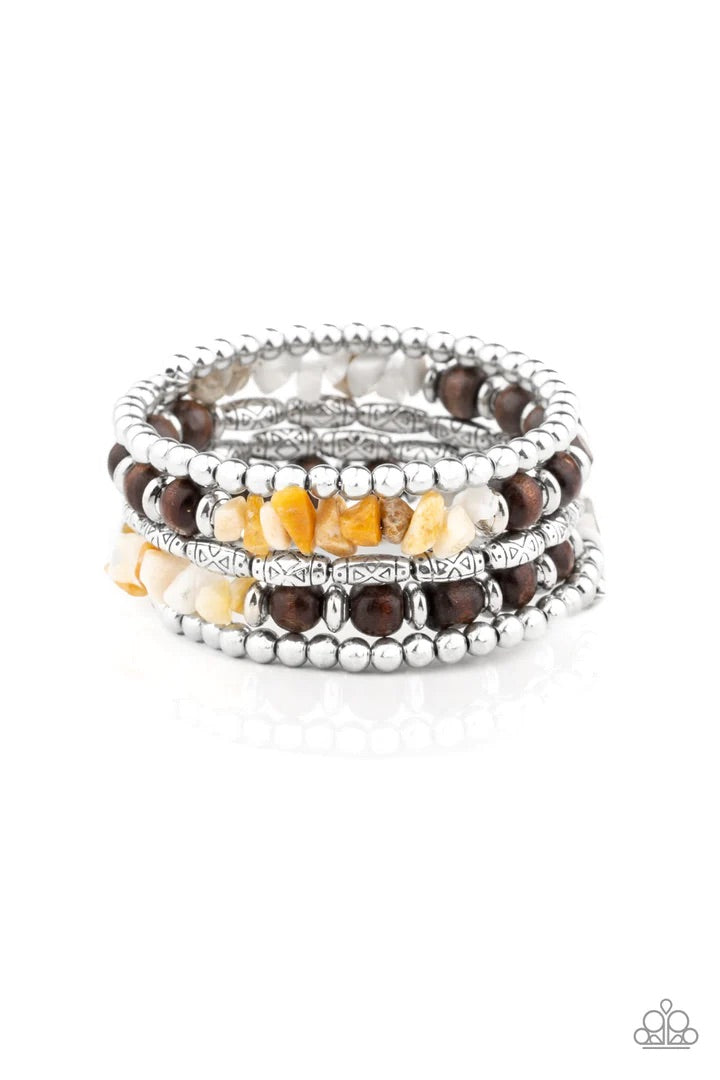 A collection of shiny silver beads, refreshing stones, wooden beads, and ornate silver accents are threaded along a coiled wire, creating an earthy infinity wrap style bracelet around the wrist.