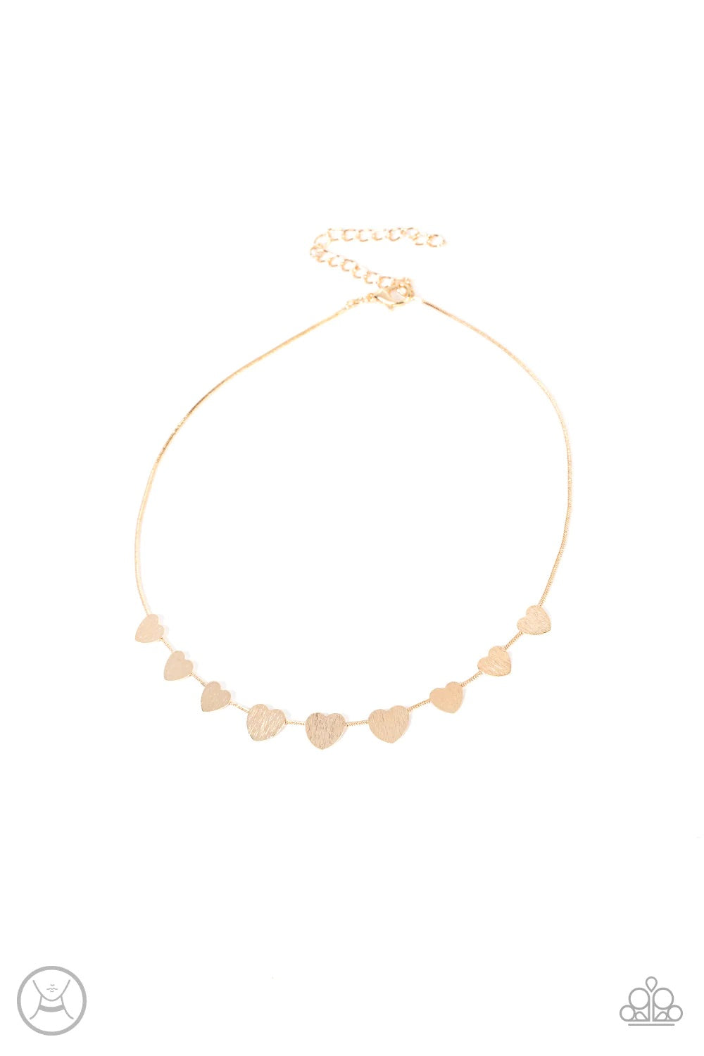 Delicately scratched in shimmer, a dainty collection of flat gold heart frames gradually increases in size along a shiny gold snake chain around the neck for a flirtatious fashion. Features an adjustable clasp closure.