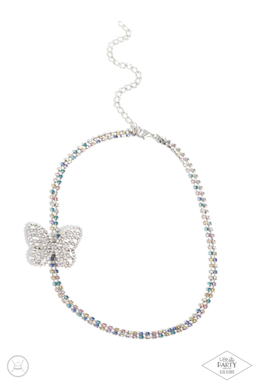 Featuring sleek square fittings, strands of glittery multicolored rhinestones connect around the neck for a glittery twist of color. Fluttering along one side of the double-layered strand, an airy, clear and iridescent rhinestone-encrusted butterfly rests for a whimsical finish. Features an adjustable clasp closure. Due to its prismatic palette, color may vary.