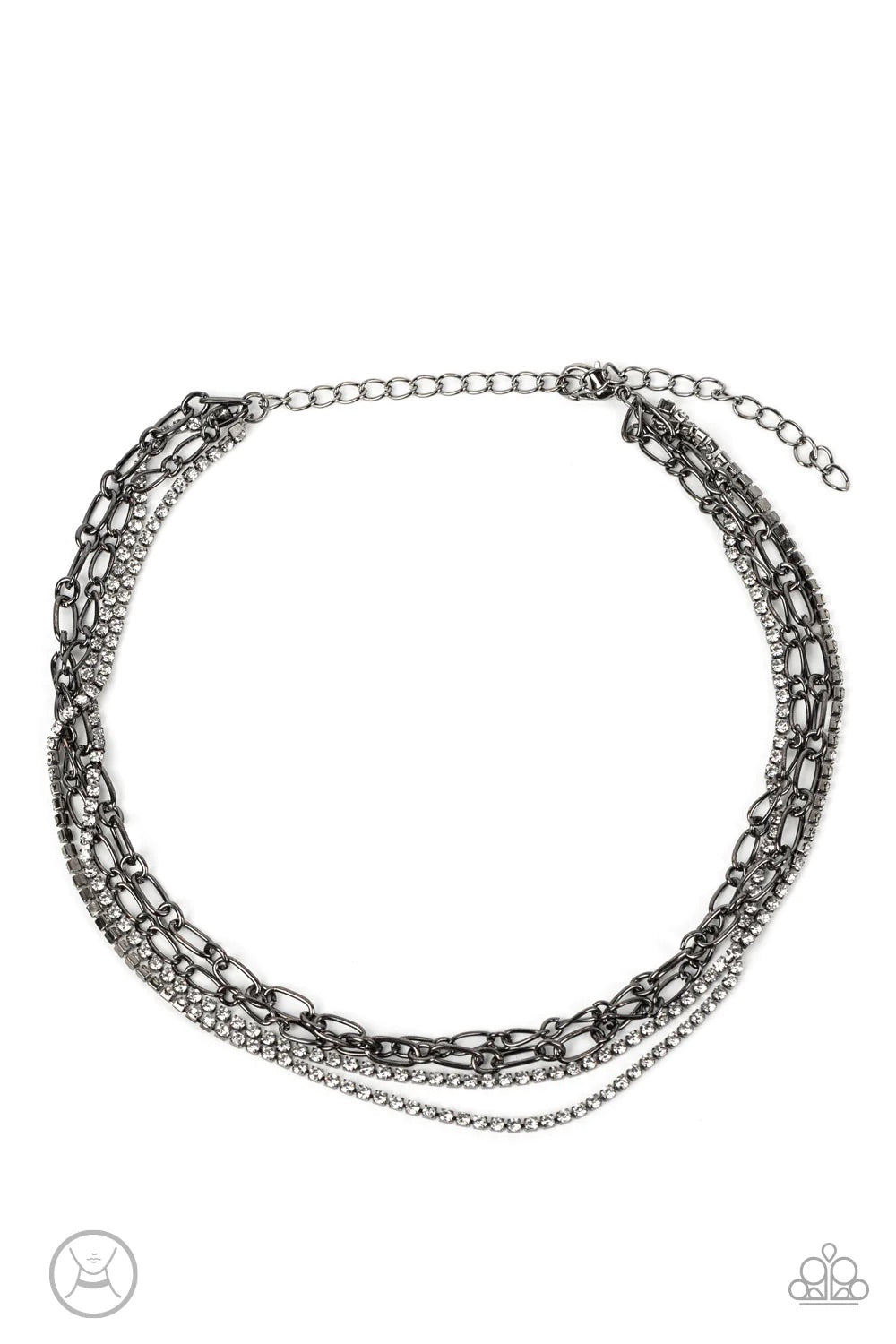 Pairs of gunmetal chains and strands of glittery white rhinestones layer around the neck, resulting in stacks of shimmer. Features an adjustable clasp closure.