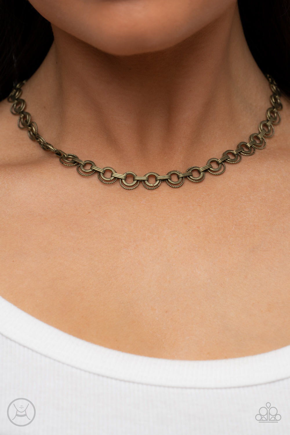 Dainty pairs of textured brass hoops and rings link with pinched brass fittings around the neck, resulting in a gritty vibe. Features an adjustable clasp closure.