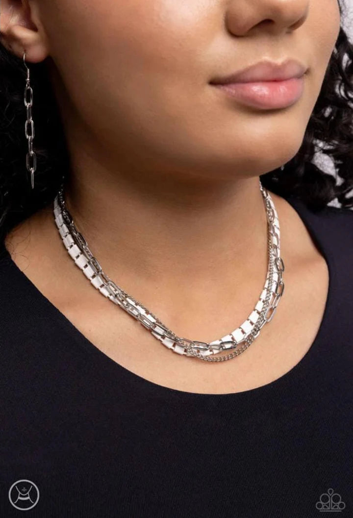 A medley of silver chains is joined by a strand of interlocking squares that are dipped in a vibrant white hue for a vibrant pop of industrial color around the collar. Features an adjustable clasp closure.
