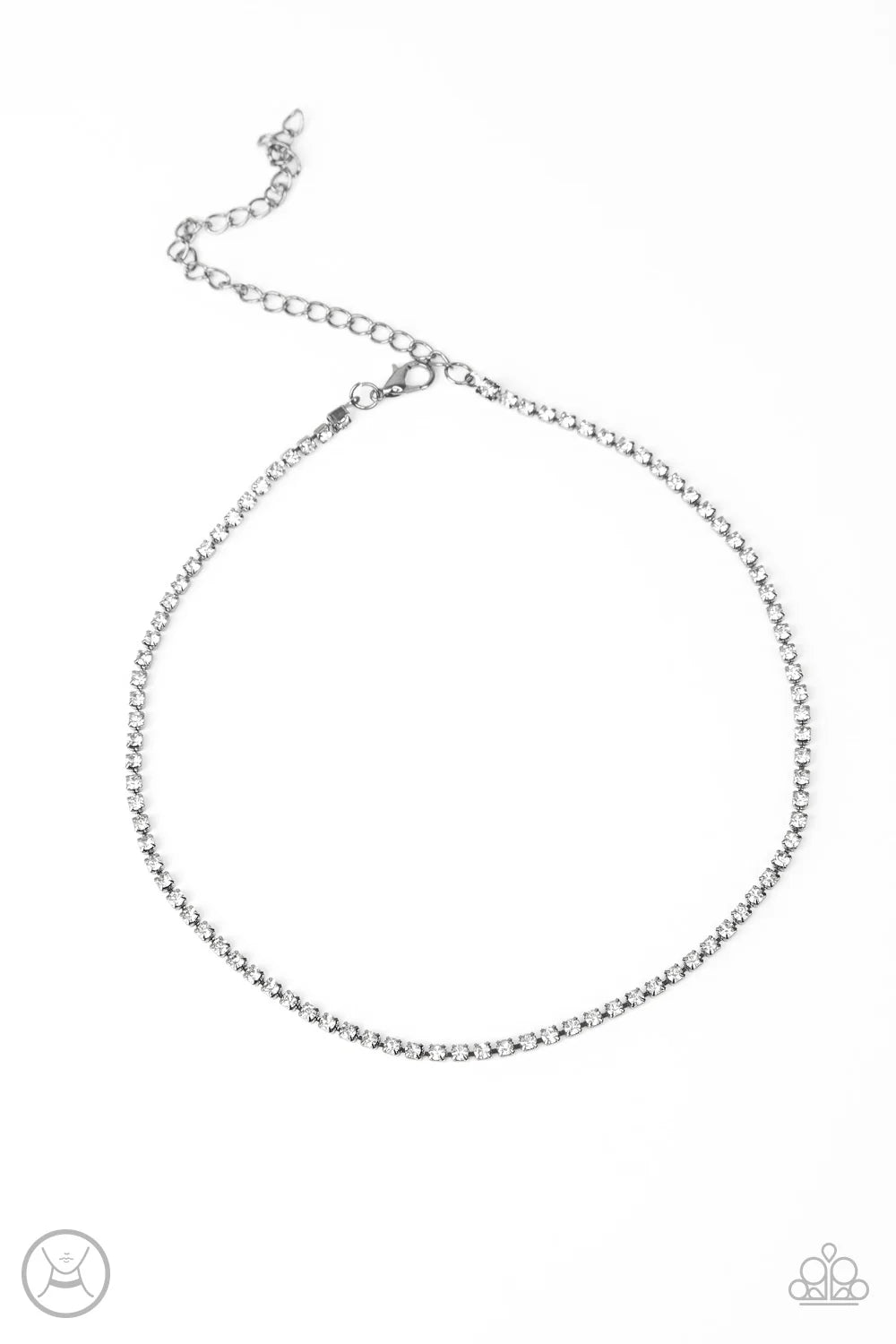 Pressed into sleek gunmetal square frames, a strand of glittery white rhinestones wraps around the neck for an edgy look. Features an adjustable clasp closure.