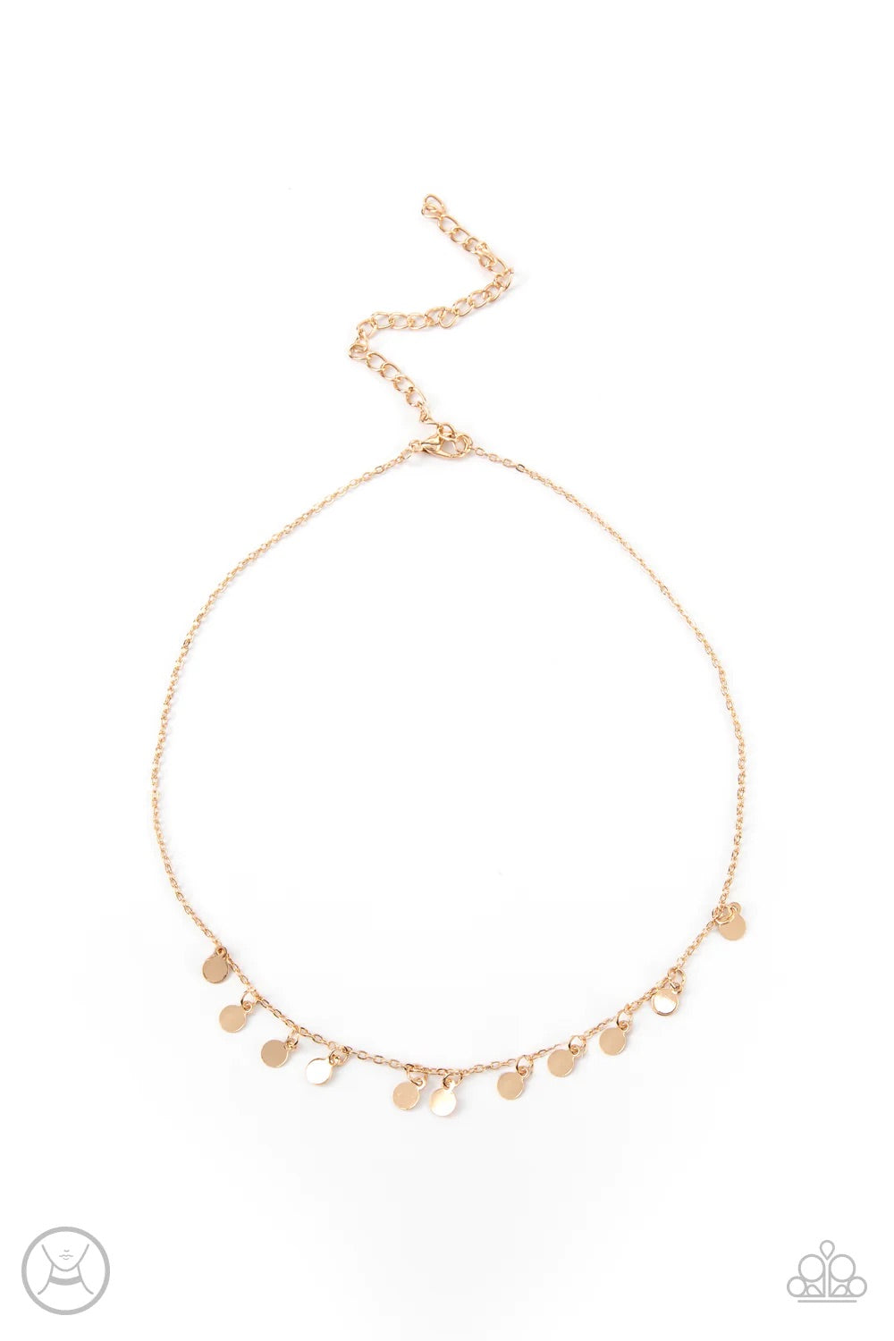 Dainty gold discs swing from a glistening gold chain, creating a shimmery fringe around the neck. Features an adjustable clasp closure.