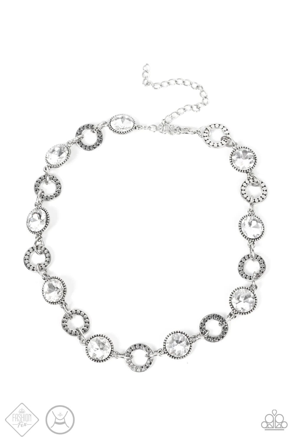 Dramatic white gems encased in daintily dotted frames link with silver rings finished with flattened studded texture. The stunning rhinestones and edgy rings alternate across the collar, resulting in an upscale industrial flair. Features an adjustable clasp closure.