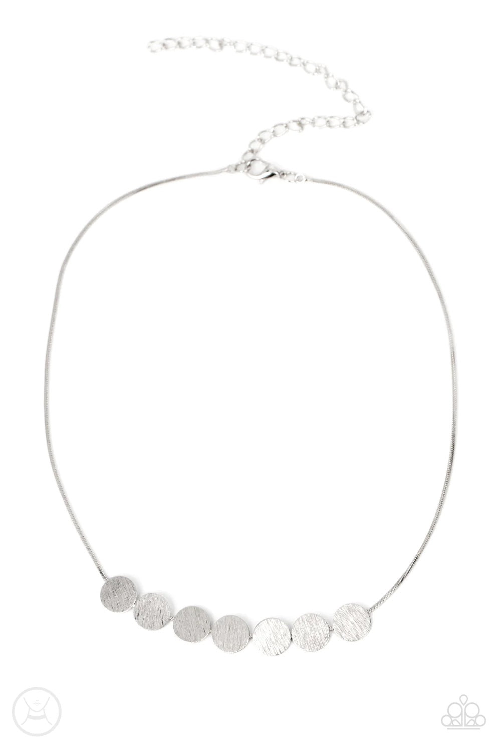 Featuring shimmery scratched surfaces, a glimmering collection of dainty silver discs are fitted in place along a silver snake chain around the neck for a sleek finish. Features an adjustable clasp closure.