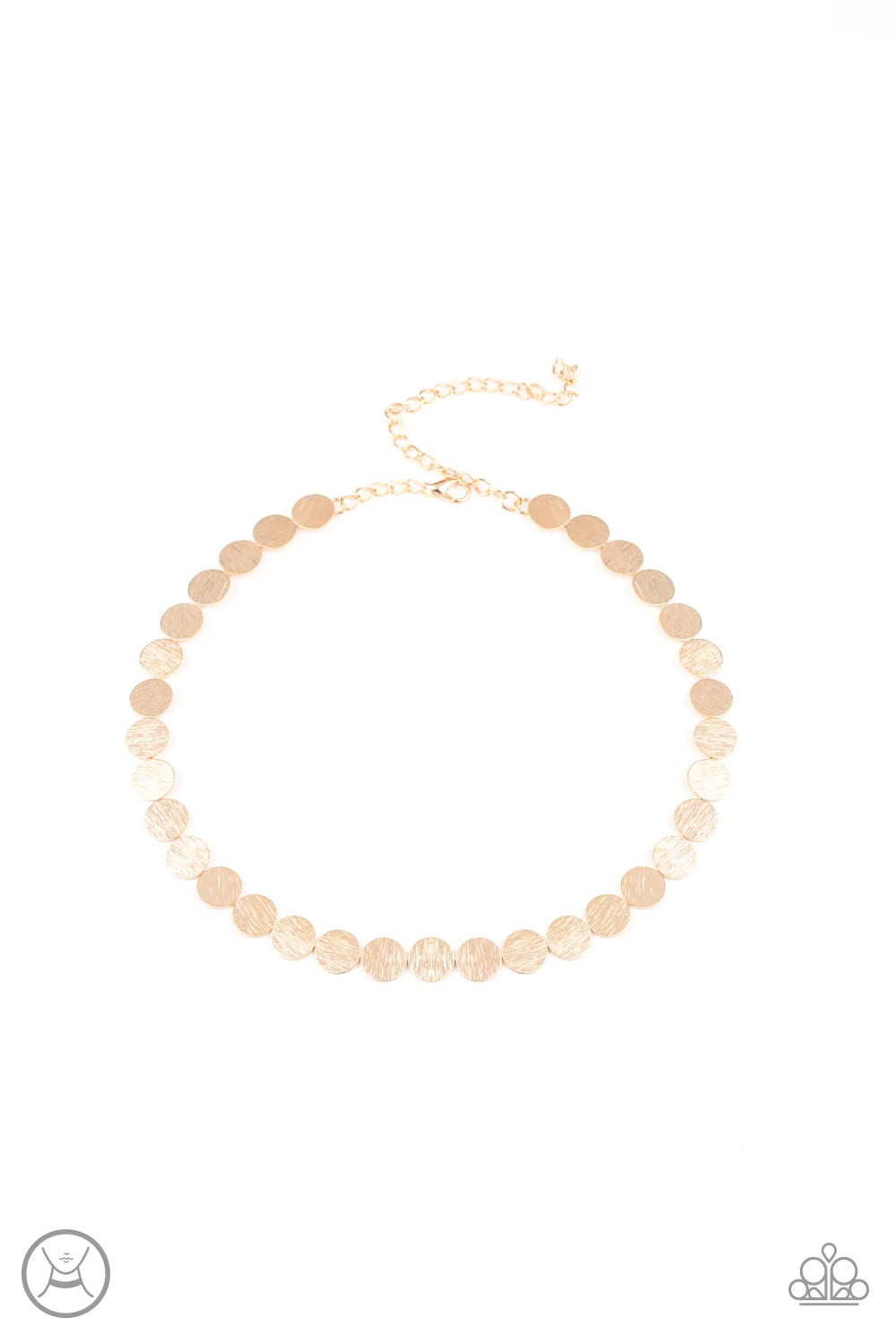 Delicately scratched in linear shimmer, dainty gold discs link around the neck for a blinding metallic look. Features an adjustable clasp closure.