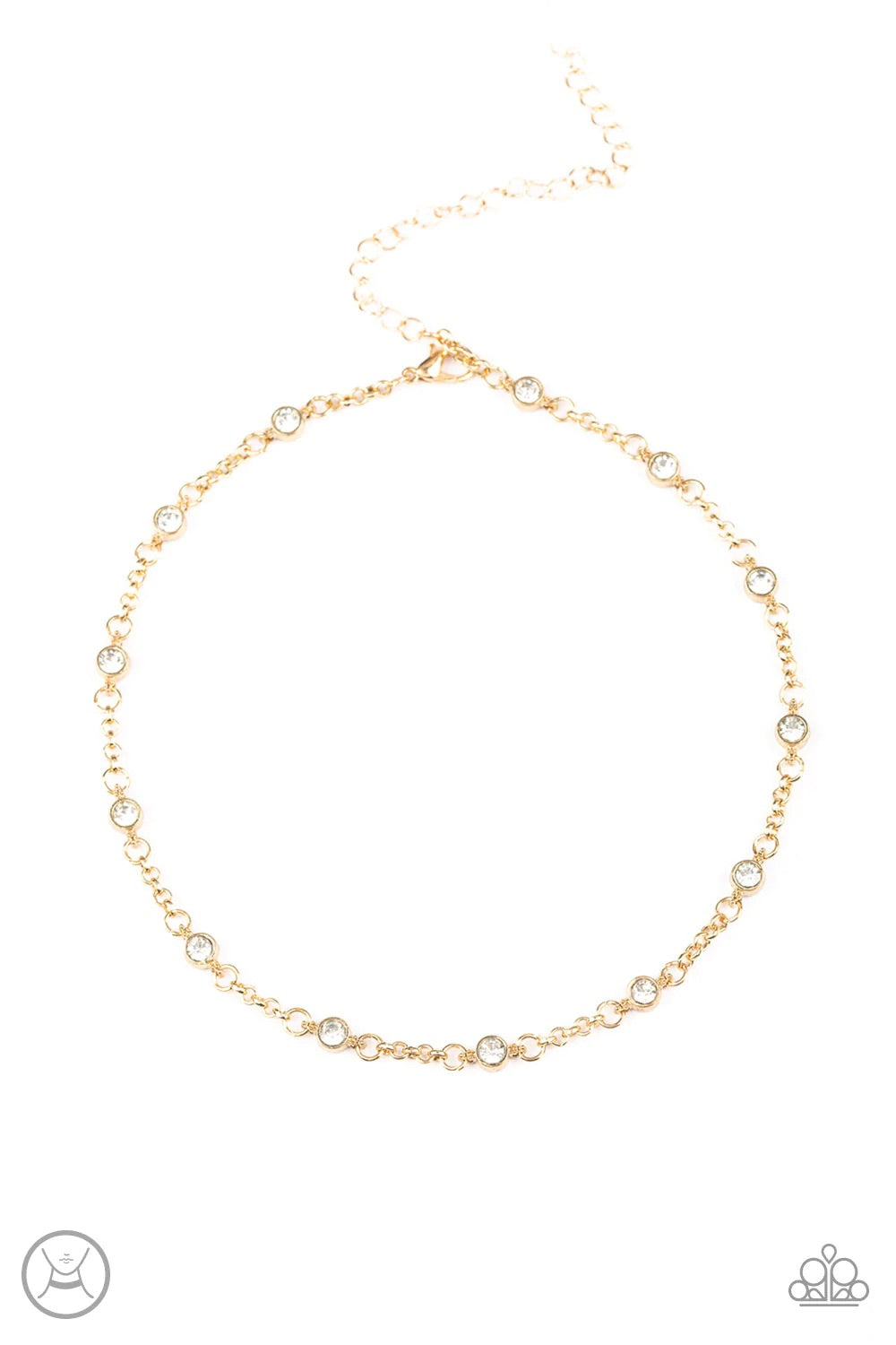 Glassy white rhinestones dot a dainty gold chain around the neck for a stunning look. Features an adjustable clasp closure.