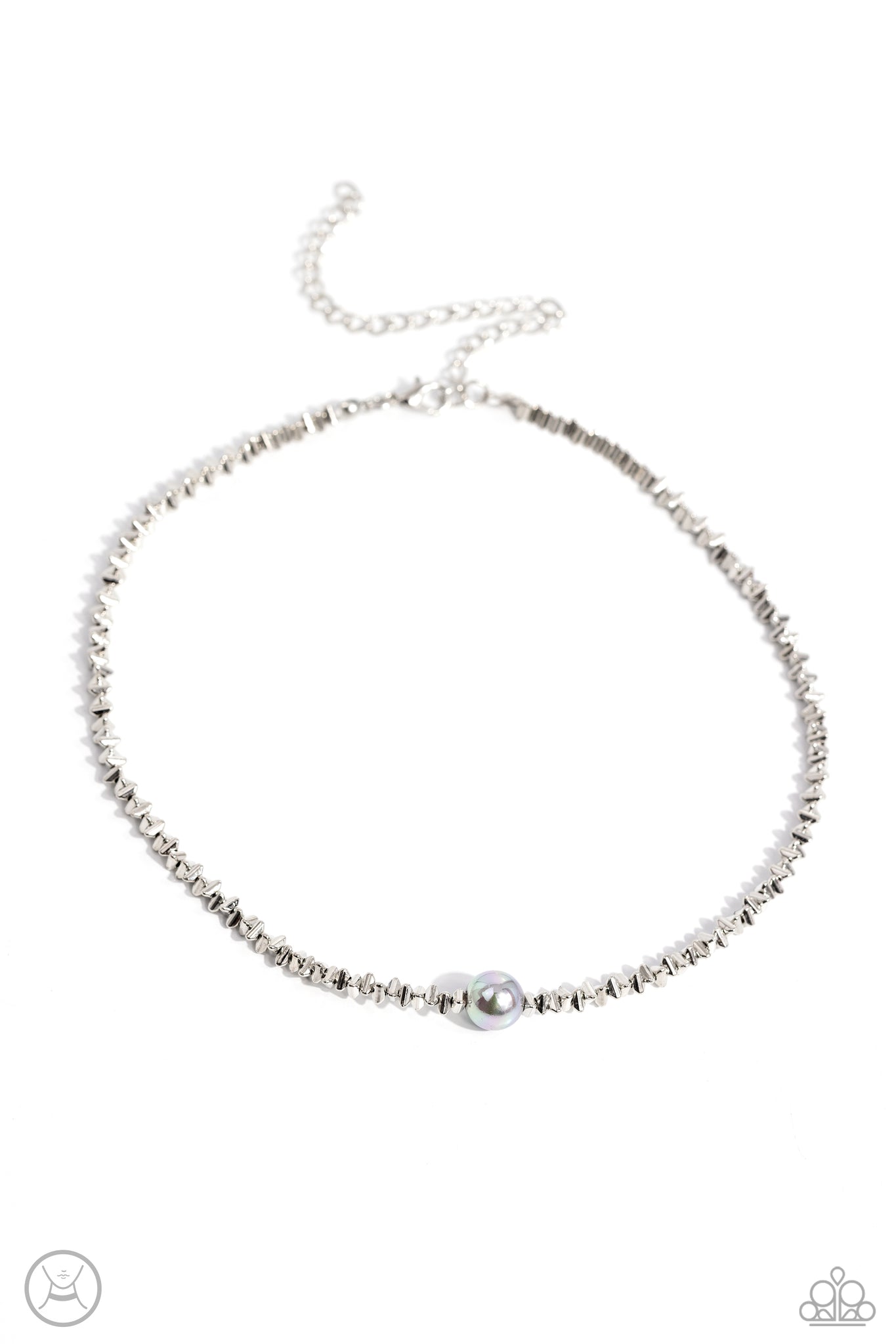 Infused along an invisible string, an edgy collection of high-sheen silver triangle beads coalesces around the collar to meet a gray pearl at its center for a refining finish. Features an adjustable clasp closure.