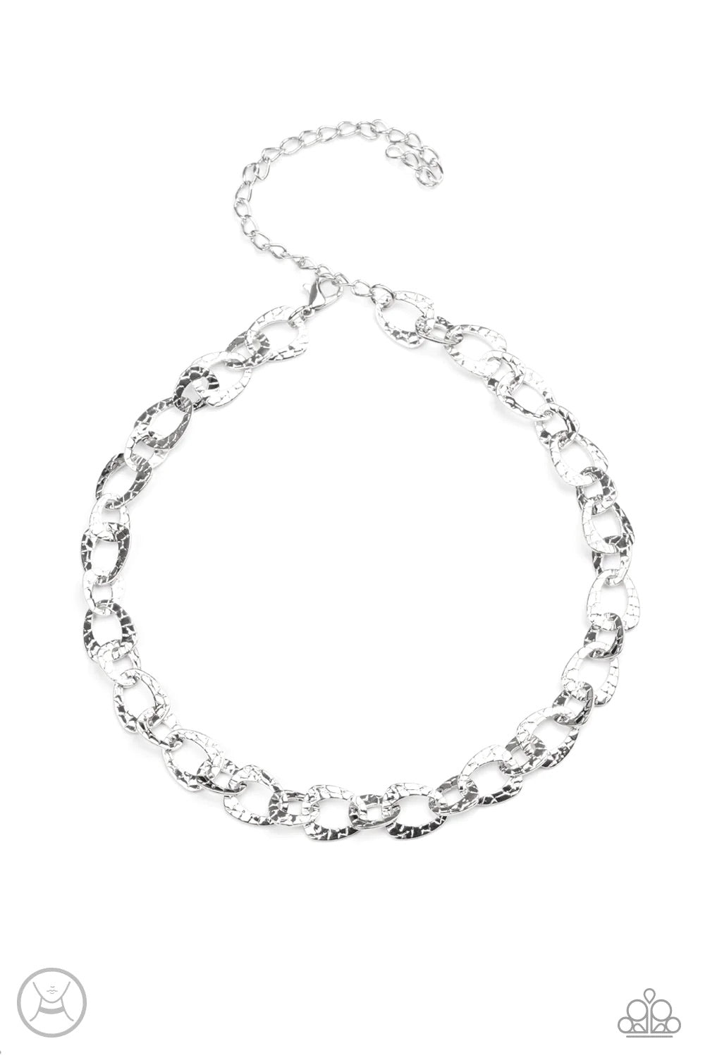 Embossed in a metallic crocodile-like print, asymmetrical silver links delicately connect around the neck for a wild industrial inspired look. Features an adjustable clasp closure.