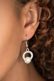 A pearly white bead is pressed into the bottom of a white rhinestone encrusted hoop, creating a refined lure. Earring attaches to a standard fishhook fitting.