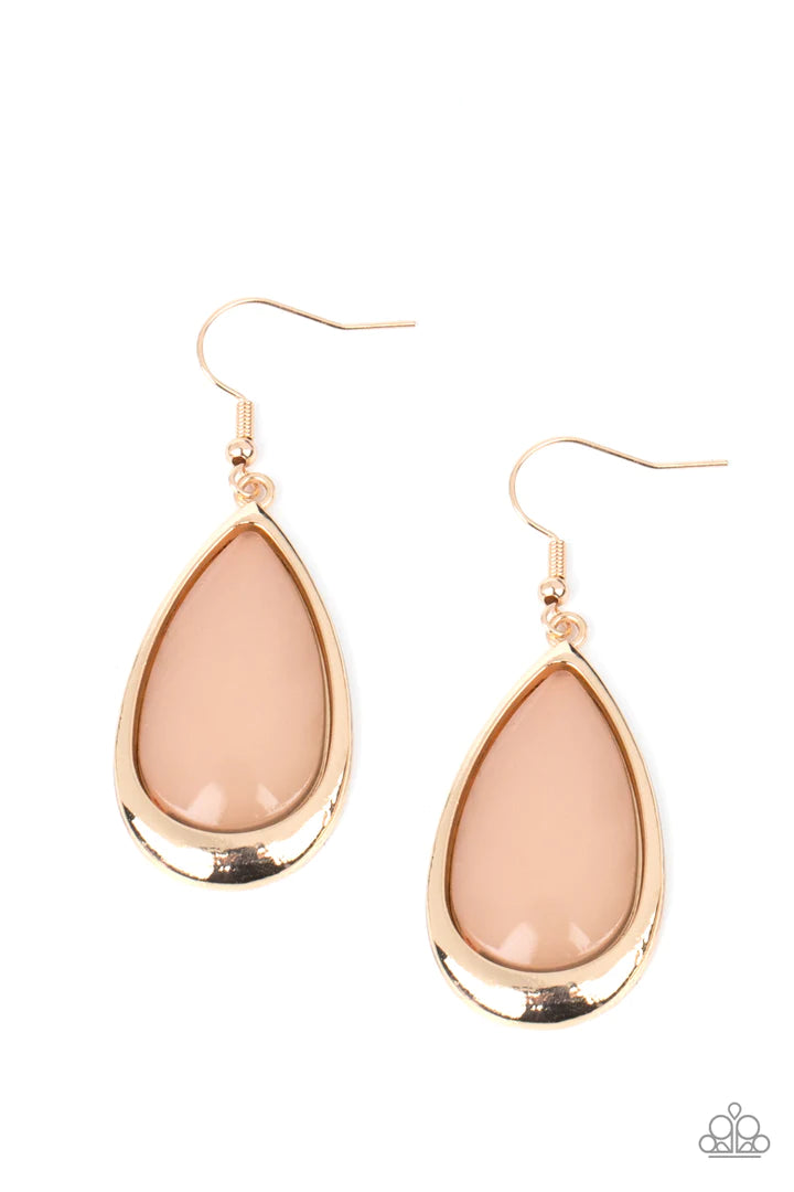A glassy brown teardrop is nestled inside a glistening gold frame, creating an ethereally elegant lure. Earring attaches to a standard fishhook fitting.