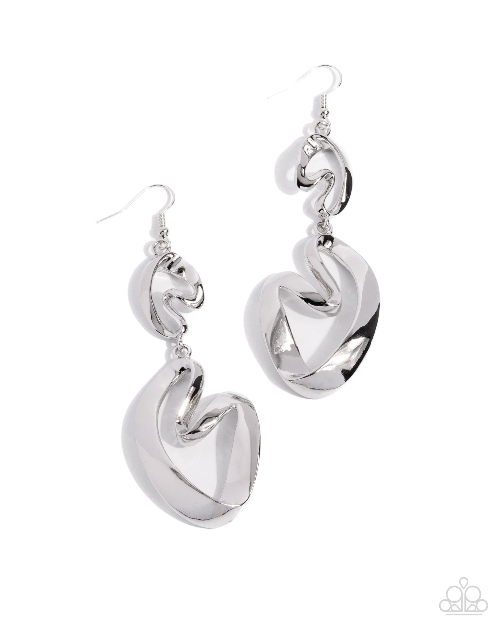 Featuring a reflective sheen, twisted ribbons of silver in varying sizes delicately link into an abstract lure for a whimsical fashion. Earring attaches to a standard fishhook fitting.