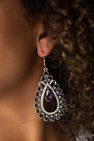 A purple teardrop gem swings from the top of a frilly silver frame radiating with glassy white and glittery purple rhinestone encrusted petals for a regal look. Earring attaches to a standard fishhook fitting.