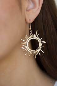 Glistening gold bars flare from a round center, creating a radiant sunburst pattern for a summery look. Earring attaches to a standard fishhook fitting.