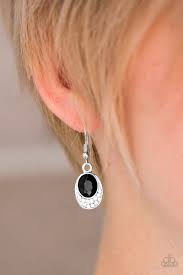 A faceted black gem is pressed into a silver frame dipped in glittery white rhinestones. Earring attaches to a standard fishhook fitting.