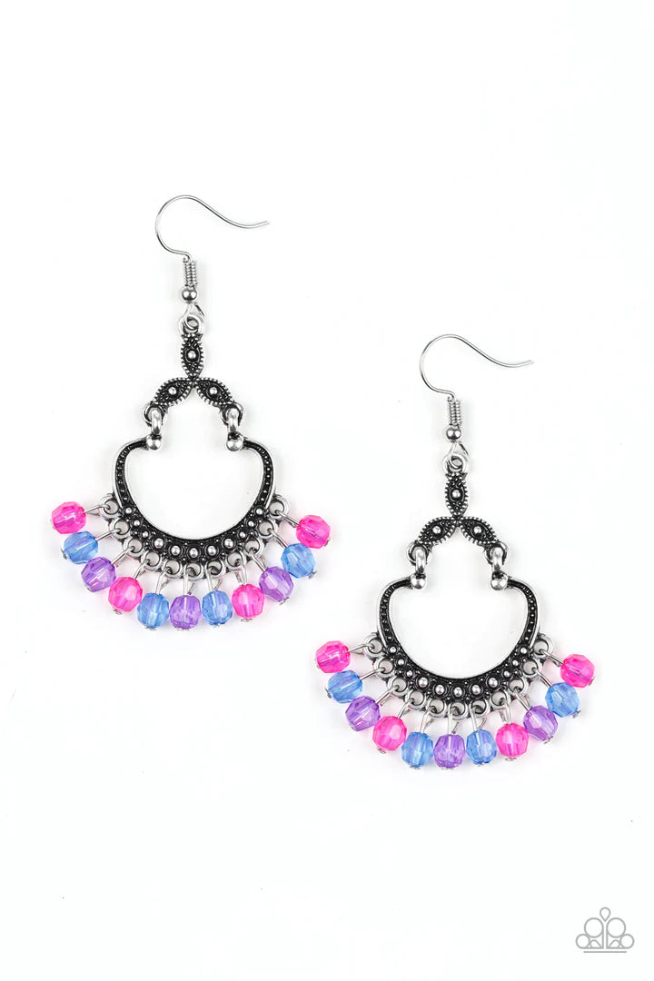 Faceted blue, pink, and purple beads swing from the bottom of a studded silver frame, creating a whimsical lure. Earring attaches to a standard fishhook fitting.