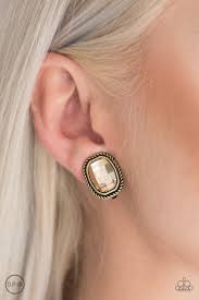 Faceted faux topaz gems are pressed into textured brass frames for a refined look. Earring attaches to a standard clip-on fitting.
