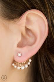 A dainty white pearl attaches to a double-sided post, designed to fasten behind the ear. Brushed in a high-sheen shimmer, the pearl encrusted double-sided post peeks out beneath the ear for a refined look. Earring attaches to a standard post fitting.