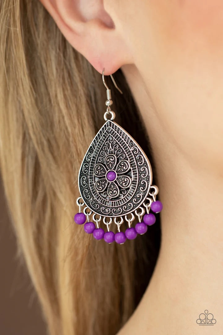 Dotted with a dainty Amethyst Orchid bead, a silver flower is surrounded by an antiqued silver filigree teardrop frame. A row of Amethyst Orchid beads at the bottom of the teardrop adds color and fun for a playful look. Earring attaches to a standard fishhook fitting.
